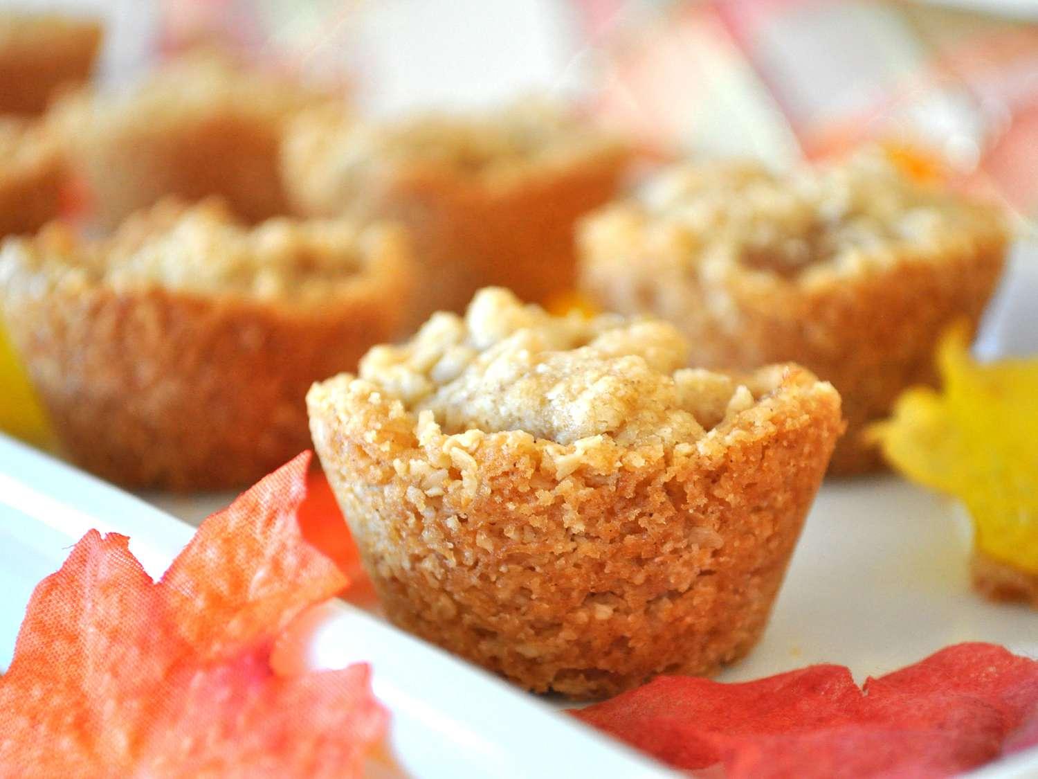 - Combine flour, oats, brown sugar, 1 teaspoon of cinnamon, and nutmeg in a large bowl; cut the butter into the flour mixture with a pastry cutter until the mixture looks like coarse crumbs. Place a heaping tablespoon of the crust mixture into a mini muffin cup, and press it into the cup so that it covers the bottom and pushes up the sides of the cup. Make the crust go all the way to the top of the little muffin cup, and patch any holes with more crust mixture. There will be crust mixture left over. Place about 2 teaspoons of apple filling in the crust. Sprinkle about 1 teaspoon of the remaining crust mixture on the filling.
