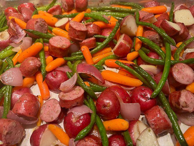 - Bake in the preheated oven for 15 minutes. Add sausage pieces to the pan and toss.