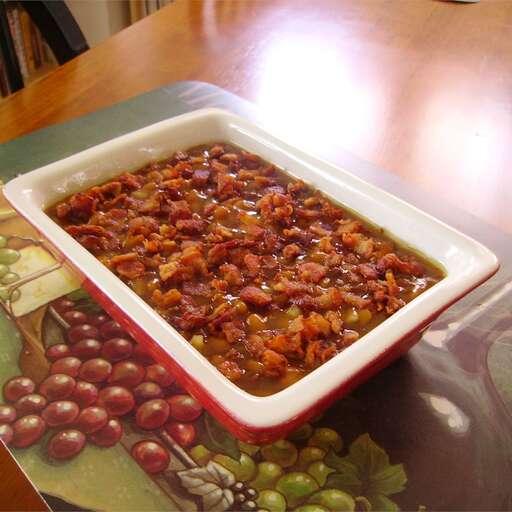 - Combine pork and beans, onion, brown sugar, Worcestershire sauce, and mustard in a 2-quart casserole dish. Chop drained bacon and stir into pork and beans mixture. Cover dish with aluminum foil.